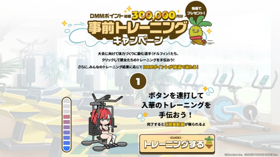 Você pode ajudar os jogadores a treinar clicando e apertando vários botões. Os pontos DMM serão concedidos por sorteio de acordo com o número total de calorias(*) consumidas, e os vídeos de recompensa serão exibidos após a conclusão do treinamento.
