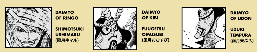 Oda: “Já recebi muitas perguntas sobre este senhor. A identidade de uma certa pessoa. Acho que seria rude revelá-lo, dado como ele intencionalmente escondeu essa pessoa, mas como muitas pessoas adivinharam, vou apresentá-lo. Esses três homens são De fato, as terras daimyo caíram em ruínas.