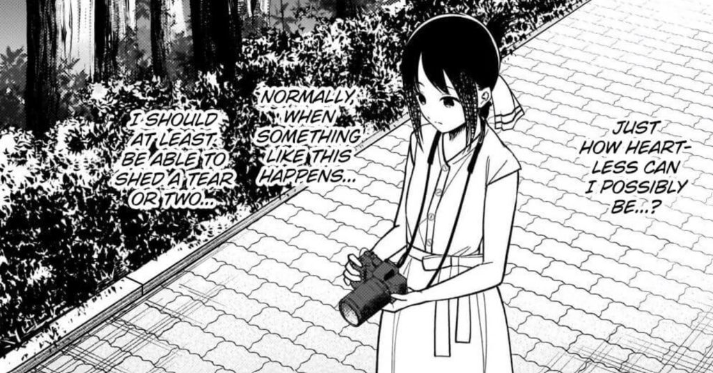 Os fãs poderão se encontrar com os personagens de Kaguya-sama por mais uma semana após o repentino atraso no capítulo na semana passada. Assim, a história começará exatamente do mesmo ponto de onde partiu. Kaguya estava se sentindo presa em sua própria casa após a morte de seu pai. Somando-se a essa confusão estava o fato de que ela estava tendo um desempenho mediano como fotógrafa. E assim, o próximo capítulo seria inteiramente sobre Kaguya.