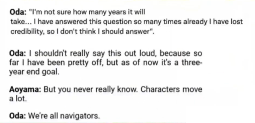 Em uma entrevista com Aoyama, Oda reiterou que ONE PIECE está programado para terminar em 5 anos e que o fim da série está totalmente planejado. Mas, no depoimento a seguir, o autor afirma que seu objetivo pessoal é terminar One Piece em cerca de 3 anos.