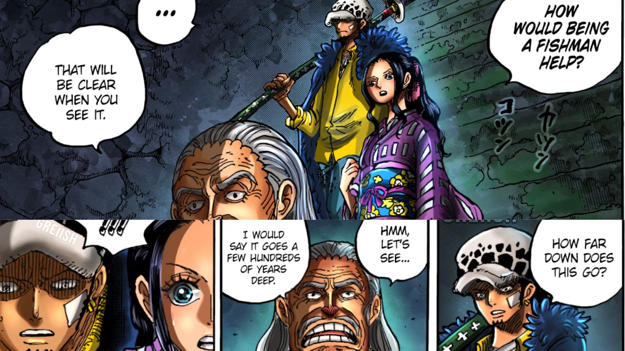 Robin e Sukiyaki continuam sua jornada em Wano através de um corredor no porão e são acompanhados por Law. Sukiyaki diz a eles que ele nunca contou a Orochi e Kaido sobre a passagem secreta, mas que eles ainda conseguiram encontrar Load Poneglyph devido a Jack “A fishmen” em sua tripulação. Quando Robin pergunta como ser pescadora a ajuda a encontrar Poneglyph, Sukiyaki diz a ela para procurar pela janela.