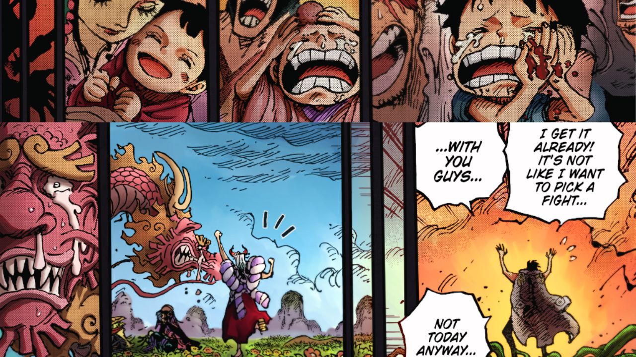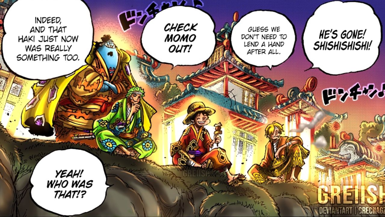 No painel final de One Piece Chapter 1055 Raw Scans, vemos Luffy, Zoro, Sanji e Jinbei sentados do lado de fora da capital das flores. Sanji diz que eles não precisavam da ajuda deles e Aramaki foi embora. Jinbe diz que foi impressionante e Haki foi outra coisa. Luffy diz que um rosto familiar apareceu em sua cabeça quando sentiu Haki.