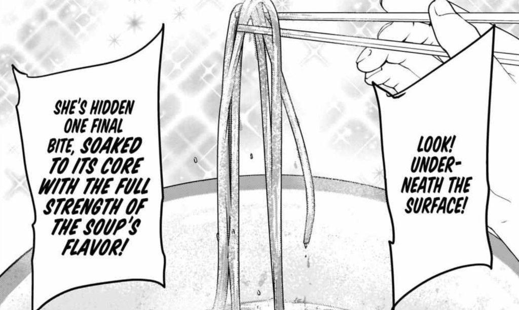 E quando Ichikawa deu a última mordida no ramen, os capangas ficaram chocados por ela ter conseguido provar o sabor. de toda a sopa e seus sabores. Mas ela ainda não tinha terminado. A senhora pediu mais macarrão mais tarde. A parte final do capítulo viu o encerramento do “Arco dos Quatro Imperadores Ramen”, com Ichikawa alegando que ela só comeria Sushi ou Yakiniku se esta fosse a última refeição de sua vida.