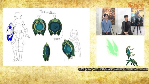 Terminando a transmissão, Suwa foi questionado sobre todos os novos escudos que aparecem na 2ª temporada, e se havia algo que ele tomou cuidado ao projetá-los. Suwa revelou que na verdade não havia projetos oficiais para as costas dos escudos! Era algo que ainda precisava ser esclarecido para fins de animação:”Ele está segurando o escudo, ou está grudado nele?”. Tendo feito os designs para a primeira temporada, Suwa fez novos designs para cada um dos novos escudos nas versões’segurado’e’preso a ele’, que é como todos os designs operaram desde então, consistente com os outros escudos da série..
