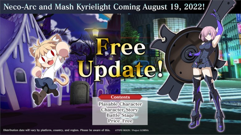 O popular jogo de luta receberá um patch-gratuito-que adicionará dois personagens jogáveis adicionais, histórias de personagens e estágios de batalha. Neco-Arc e Mash Kyrielight, os mais novos personagens adicionados à lista, serão jogáveis em 19 de agosto de 2022, às 6h (UTC).