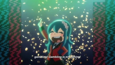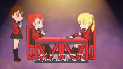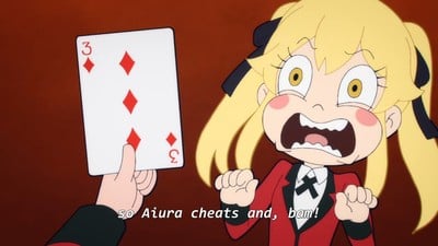 Fiquei realmente chocado quando ficou claro desde o início que ela seria uma personagem real, com sua própria influência na narrativa. Ela pode ter assinado sua agência pessoal para fins de fetiche, mas ela ainda tem agência de personagem! Quanto menos falar sobre líquidos em Kakegurui, melhor. Embora eu suponha que devemos falar sobre algumas das apostas, já que esse é o principal apelo da série além do sadomasoquismo sáfico. É uma pequena coleção de jogos, dada a natureza abreviada da adaptação, mas há algumas preciosidades. E alguns insucessos.