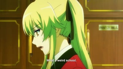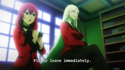 Sim , todo personagem coadjuvante popular merece sua própria história de origem divertida, então dar a Mary aqui o tratamento Better Call Saul faz muito sentido. Especialmente desde que Yumeko se transferiu no segundo ano de aulas no programa original, o que significa que há muito tempo para ver como uma pessoa um pouco menos desequilibrada poderia ter lidado com a academia. Ah sim, estou de volta ao meu elemento, e esse elemento são as mulheres de anime fazendo sua melhor representação do Grinch sorrindo. Me sinto em casa. Com o gosto particular da Twin em filtros de cores indo além para deixar claro para nós o quão”verde”Mary é neste novo ambiente.