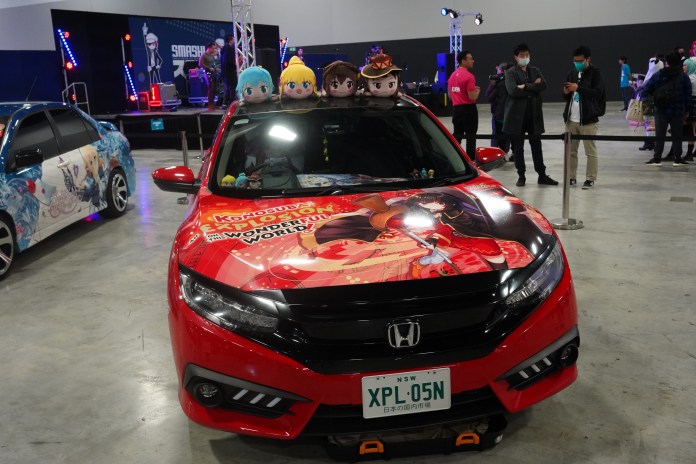 A exibição de itasha era atraente, com carros decorados em homenagem a Violet Evergarden, Princes Connect! Re:Dive e Megumin de Konosuba entre outros!