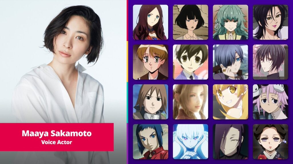 Maaya Sakamoto é uma atriz, cantora e cantora japonesa dubladora que fez sua estréia como dubladora em 1992 como Chifuru em Little Twins, mas ela é mais reconhecida como a voz de Hitomi Kanzaki em The Vision of Escaflowne: outros papéis notáveis ​​​​de anime incluem Leila Malcal em Code Geass: Akito the Exiled, Jeanne d’Arc em Fate/Apocrypha, Shiki Rygi em The Garden of Sinners, Riho Yamazaki em Nightwalker: The Midnight Detective, Moe Katsuragi em Risky Safety, Princess Tomoyo em Tsubasa: Reservoir Chronicle, Haruhi Fujioka em Ouran High School Host Club.