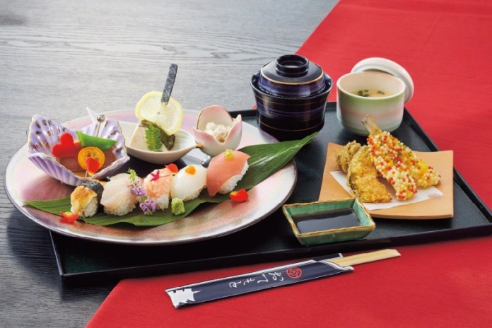 O Salmão com tema de Toge Inumaki! Maionese de atum! Kelp! (Sobremesa de chá verde com Kumquat) por 1.000 ienes (~US$ 7,20).
