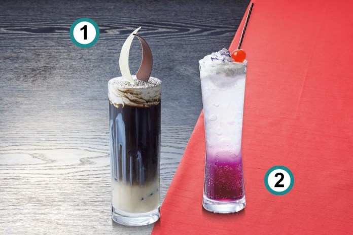 O preto e branco com tema Megumi Fushiguro Café au Lait 1.000 ienes (~US$ 7,20) e um Violet Soda com tema Maki Zenin por 1.000 ienes (~US$ 7,20).