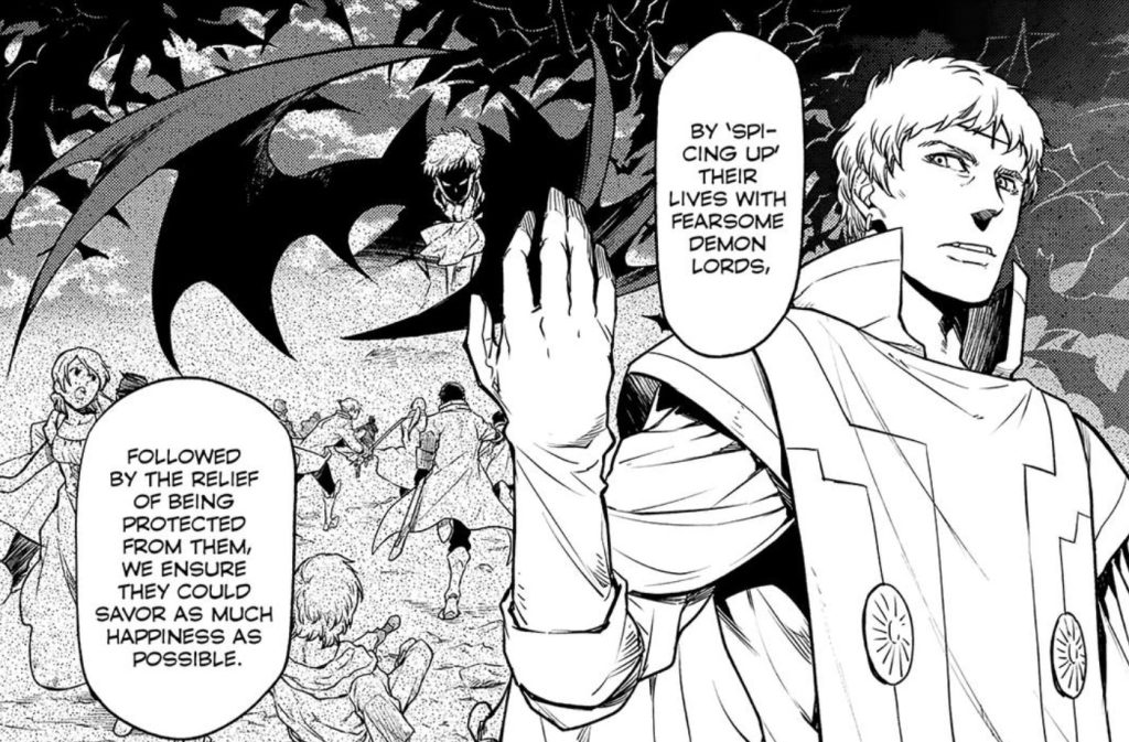 O resto do capítulo foi sobre os aprendizados da religião luminosa. No final do capítulo, a conversa tomou um rumo sério. Os cavaleiros e guerreiros discutiam as doutrinas que vinham seguindo há anos. Mas agora, era hora de mudar as coisas no mundo dos demônios. No painel final, eles ainda discutiram a história que teriam que apresentar aos cidadãos.