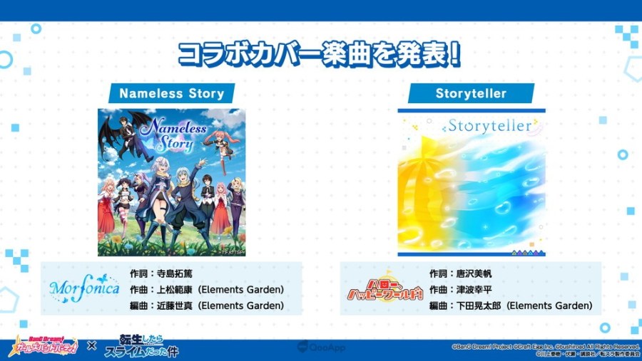 Temos dois novos covers das duas músicas de abertura do anime Tensura, “Nameless Story” e “Storyteller”! essas duas músicas serão adicionadas ao jogo quando a colaboração começar, com essas músicas sendo tocadas por Morfonica!