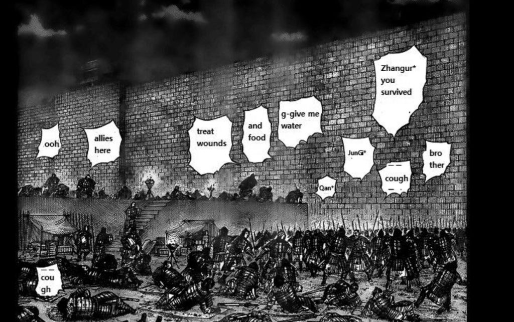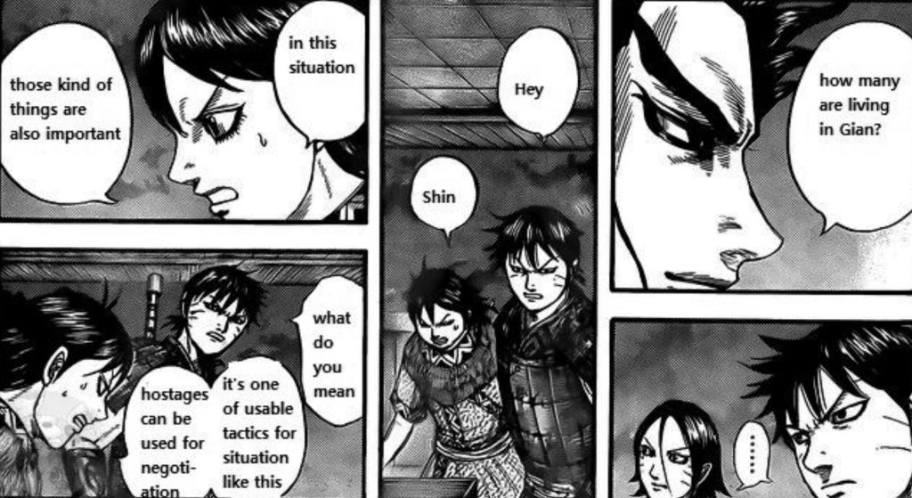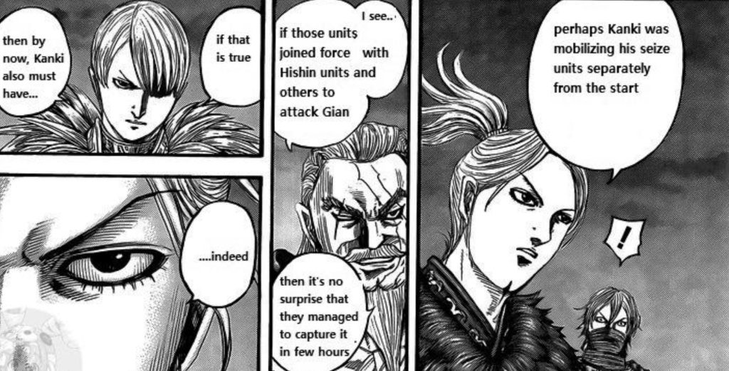 Kingdom Capítulo 736 abriu com uma cena do passado. Foi visto que Kanki havia pedido a seus homens que nadassem rio abaixo para evitar qualquer derrota. E ele também pediu a dez de seus homens que desenhassem pegadas falsas para causar confusão. O mesmo aconteceu nos aposentos de Riboku. Os homens tinham perdido Kanki de vista por causa das pegadas. O comandante também recebeu a notícia de que o castelo de Gian havia caído no chão.