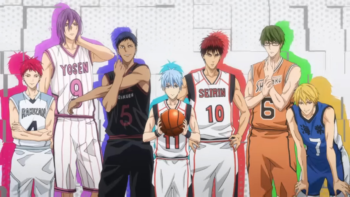 Visual principal de basquete de Kuroko, apresentando a Geração de Milagres, e Kuroko e Kagami. Crédito da foto: Production I.G