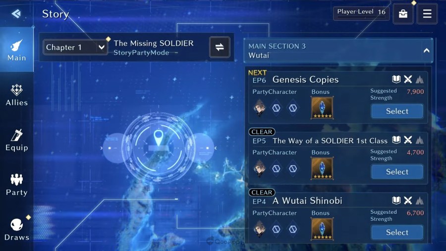 Também vimos que Ever Crisis é um jogo gacha, com o recurso de desenho visível no menu principal e trajes ou variações exclusivos para os personagens.