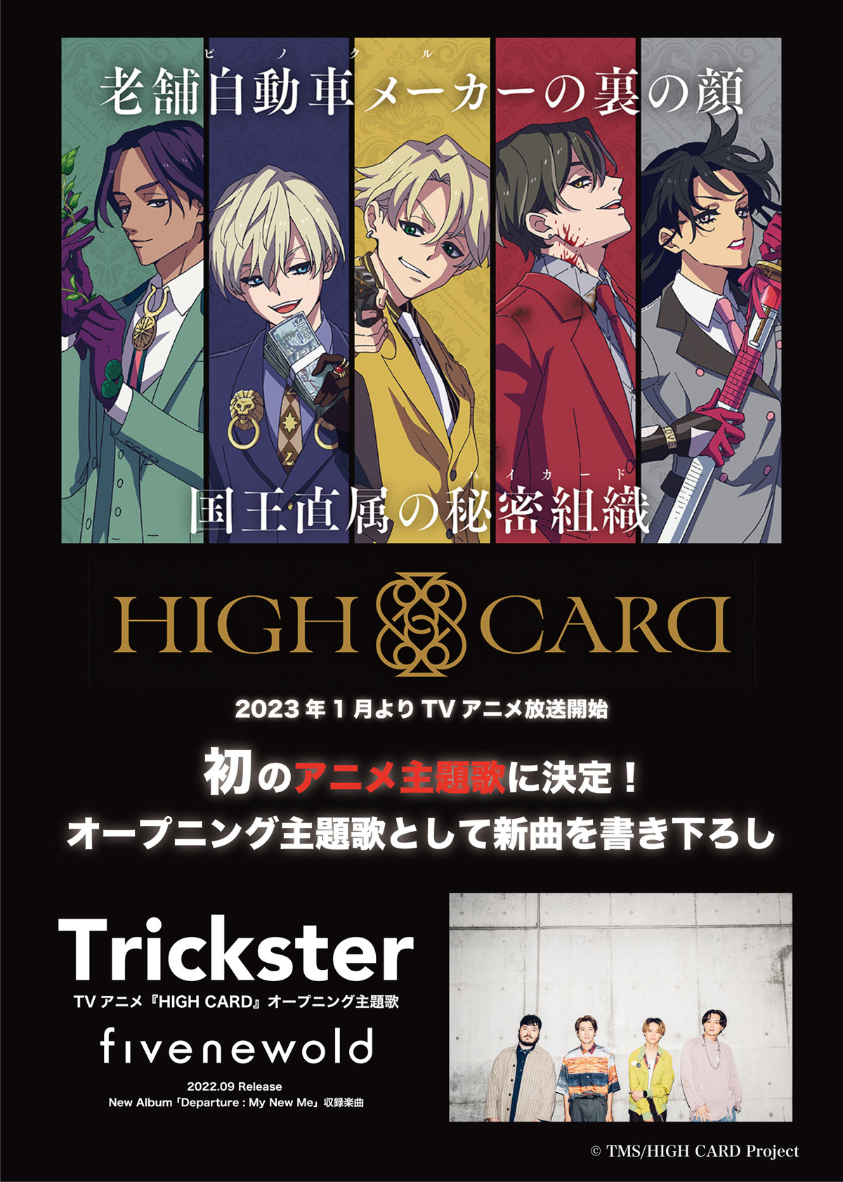 O trailer revela que a música tema de abertura do anime de TV HIGH CARD será “Trickster” da banda japonesa FIVE NEW OLD. Você pode assistir ao trailer no canal oficial da Kadokawa no YouTube aqui: