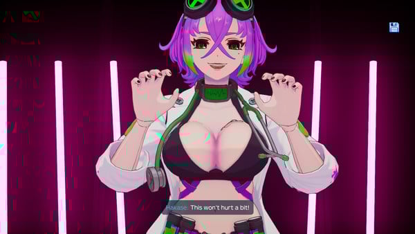 In ähnlicher Weise steckt die Zunge von Full Metal Schoolgirl fest in der Wange, denn hier nehmen mechanisierte Schulmädchen es mit Roboter-Büroangestellten auf – und übertragen sich dabei selbst per Livestream (daher die „CashChats“). Jedes Mal, wenn ich renne, muss ich lächeln, wenn ich sehe, dass die „Schlauchsocken“, die die Charaktere tragen, tatsächlich an den Beinen befestigte Booster verbergen. Gelegentlich gibt es auch Hintergrundgags, wie zum Beispiel „Working Dead“ mit einem romantischen Kabedon im Treppenhaus. Aber wie bei allen Grindhouse-Medien könnte es sein, dass einige davon ein mögliches Publikum abschrecken. Es ist ganz einfach, wenn eines Ihrer Mädchen mit der Hand auf dem Rücken die Treppe hinaufsteigt und ihr Publikum daran erinnert, nicht unter ihren Rock zu schauen. Etwas schlimmer ist es, wenn der Upgrade-Prozess im Spiel dazu führt, dass Ihr Teenager-Cyborg mit gespreizten Armen an eine Platte gekettet wird, während eine spärlich bekleidete, verrückte Wissenschaftlerin im Bikini geradezu sabbert, weil sie die Chance hat, sie in die Finger zu bekommen („Entspannen Sie Ihre Muskeln!“, sagt sie, während sich ihre Greifhände der Kamera nähern). Im Geiste der High-Concept-Stimmung von Full Metal Schoolgirl verstehe ich, woher sie kommen. Aber darauf muss das Publikum auf jeden Fall vorbereitet sein. Auch in der realen Welt könnte die Vorstellung, dass ein bewaffneter Teenager sich selbst per Livestream überträgt, während er in einem Bürogebäude herumläuft, für manche auslösend sein.