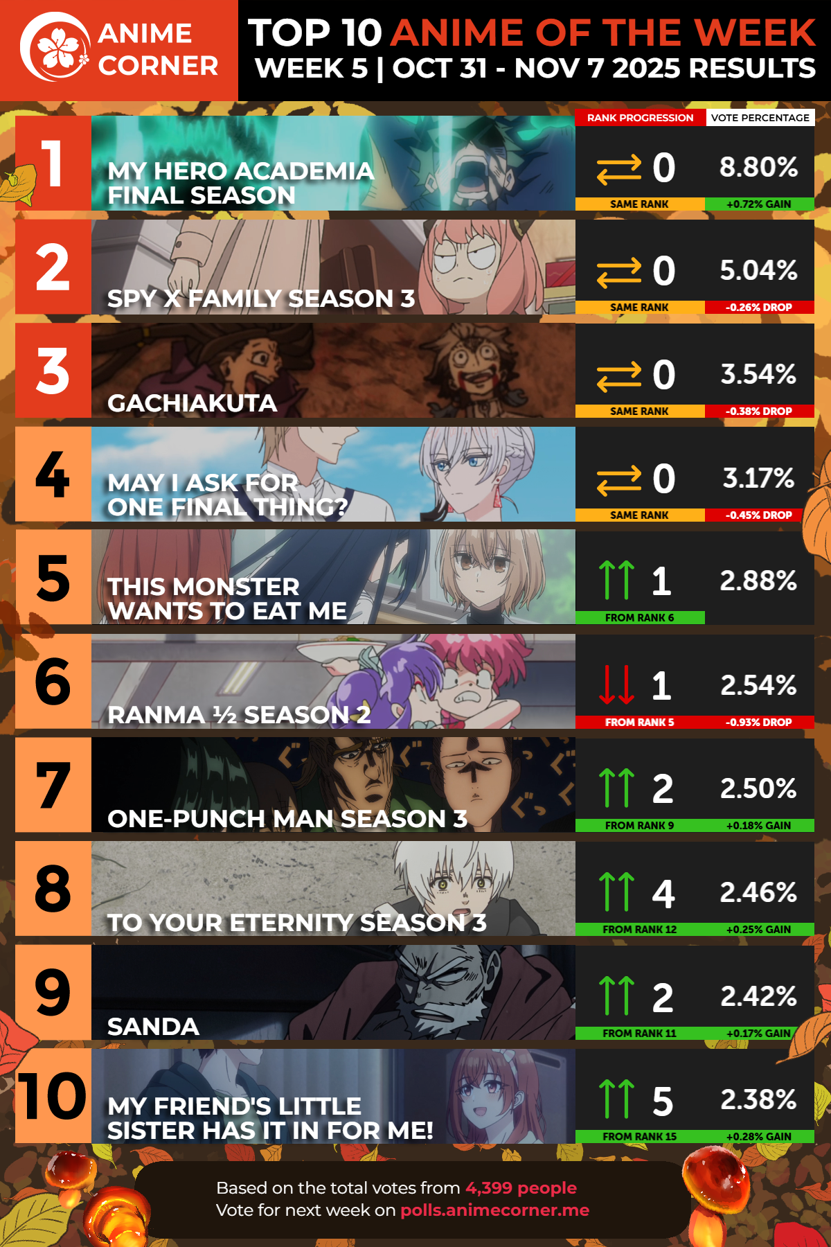 La quinta encuesta semanal para la temporada de anime de otoño de 2025, organizada por Anime Corner, ha concluido. Con más de 4.000 votos de fans de todo el mundo, los resultados ya están disponibles y revelan los 10 episodios de anime más queridos de la semana. Las clasificaciones muestran una combinación de favoritos constantes y nuevas y emocionantes entradas que dejan su huella esta temporada.
