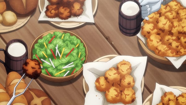 Pero si no tuviera mi experiencia como amante del bagre frito, dudo que este episodio hubiera hecho algo por mí en términos de hacerme anhelar el comida de la misma manera que la gente anhela la comida de Ghibli. Mi compañero miró el episodio en un momento y comentó que los trozos de zanas parecen nuggets de pollo falsos. Y ese es el problema aquí: las imágenes. Desde el principio vengo diciendo que visualmente esta serie no es nada espectacular. Peor aún, en realidad ha sido un poco descuidado, y cada episodio parece al menos un poco más apresurado que el anterior. Y es difícil hacer que la comida se vea bien cuando, bueno, el programa en sí no se ve tan bien en general. El programa podría potencialmente compensar eso en el proceso de preparación o al observar las reacciones a la comida, pero si bien obtuvimos algo de eso esta semana, no creo que haya hecho lo suficiente para compensar esas imágenes decepcionantes. Por cierto, ¿viste por un momento la ensalada que estaba allí? Apenas apareció en la pantalla, así que no te preocupes demasiado si no lo recuerdas, pero me gusta. Seguramente no soy sólo yo, esto parece bastante patético para los estándares de ensaladas anime, ¿verdad?