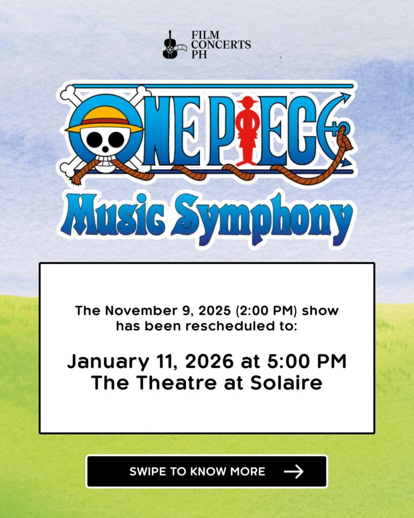 Film Concerts PH ha anunciado oficialmente que la presentación de ONE PIECE Music Symphony en Filipinas, originalmente programada para el 9 de noviembre a las 2:00 p.m., ha sido reprogramada para el 11 de enero de 2026 (domingo) a las 5:00 p.m. en The Theatre at Solaire. El primer espectáculo de la sinfónica se llevó a cabo con éxito el 8 de noviembre, pero lamentablemente el espectáculo final se pospuso debido al tifón Fung-wong (conocido localmente como Super Typhoon Uwan).