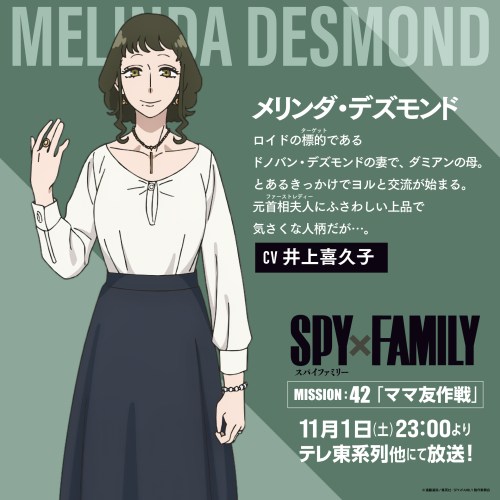 Ääninäyttelijä Kikuko Inoue on valittu Melinda Desmondin ääneksi SPY x FAMILYn meneillään olevalle kolmannelle tuotantokaudelle. Kolmannen tuotantokauden esitys Japanissa alkoi 4. lokakuuta 2025.