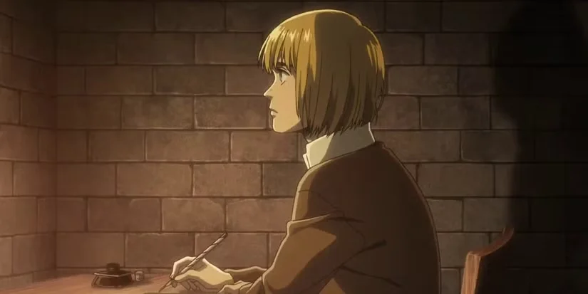 À Stohess, Armin aide tendez le piège à la Titan Femelle en cartographiant les schémas de patrouille d’Annie, en exploitant le réseau de tunnels souterrains et en chronométrant le cordon de la police militaire pour forcer une transformation là où l’équipement de confinement est déjà placé. Il recoupe le comportement d’Annie lors de la poursuite en forêt avec les voies d’évacuation dans les rues de la ville, puis aligne ses escouades pour l’intercepter, ce qui aboutit à un confinement rare au milieu de la ville qui évite un effondrement urbain plus large.