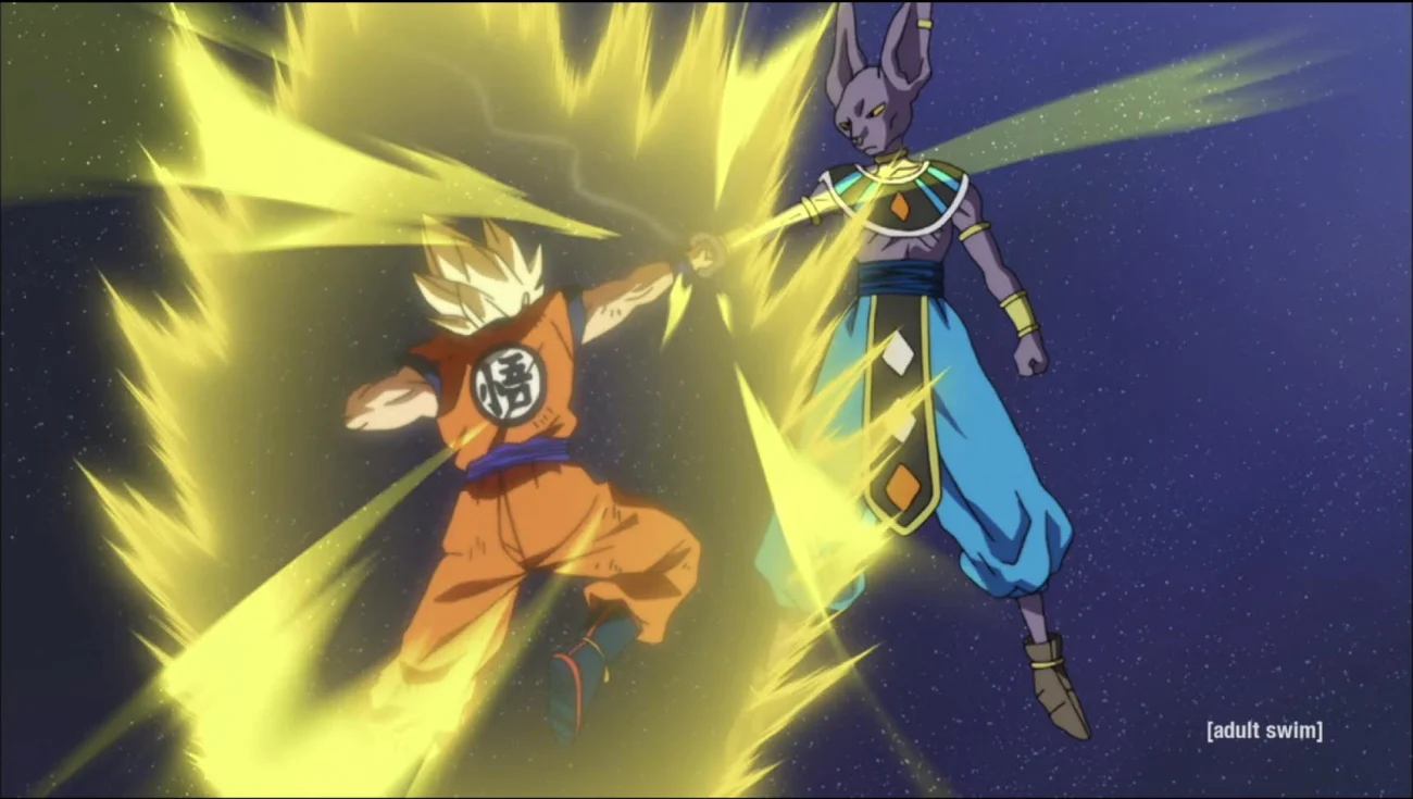 Beerus, un dieu de la destruction, arrive à la recherche du Dieu Super Saiyan et démontre une puissance occasionnelle à l’échelle planétaire. Les premières tentatives de Vegeta et d’autres sont à peine enregistrées, Beerus donnant le ton et mettant fin aux échanges à volonté. Ce n’est qu’après un rituel divin que Goku accède à une forme qui peut l’engager de manière significative, et même alors, Beerus gère l’intensité. Le cadre de combat met en évidence un écart entre les niveaux divin et mortel dans leurs rôles et leurs capacités.