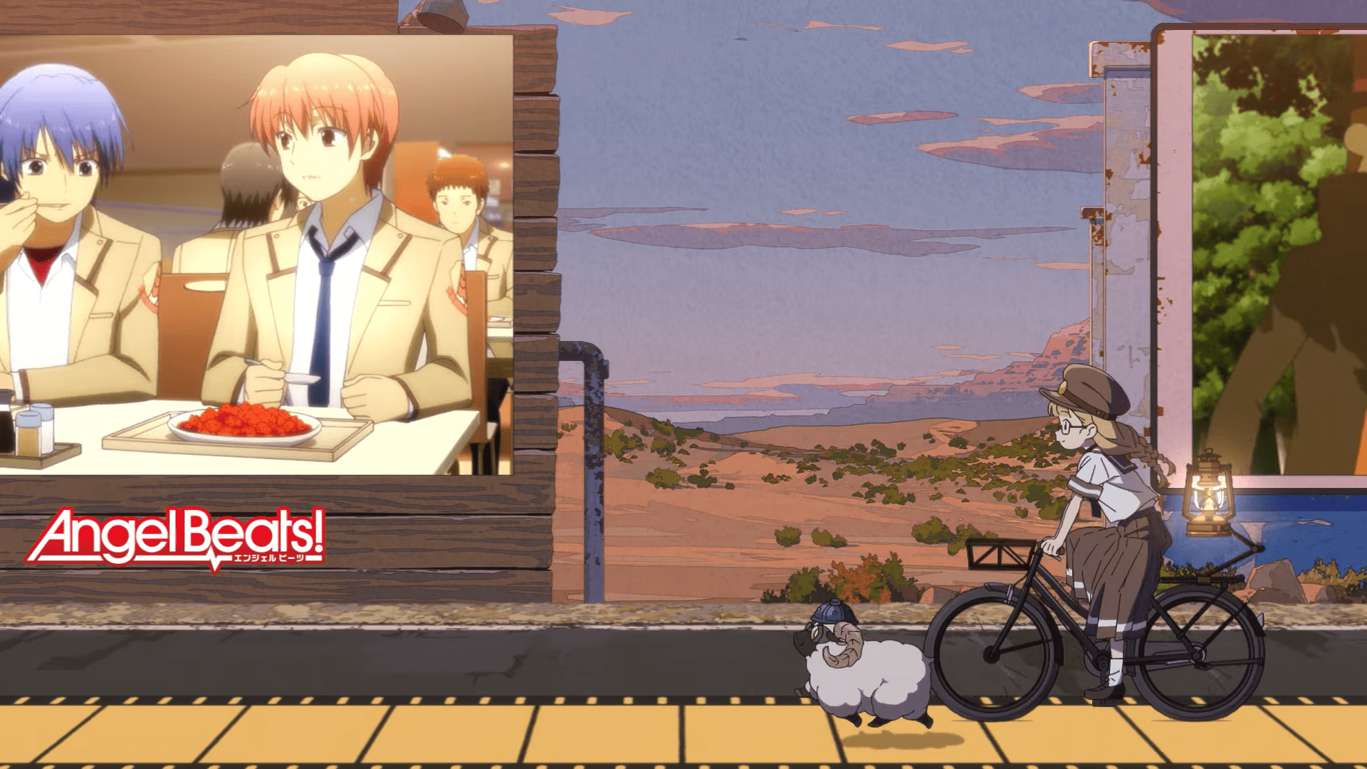 Elle représente une fille et ses moutons voyageant sur un chemin devant des écrans affichant des productions de P.A.Works, depuis des anime d’avant 2010 comme True Tears de 2008 (le premier du studio) et Canaan de 2009 jusqu’à Angel Beats de 2010, NagiAsu-A Lull de 2013. in the Sea-, et Skip and 2023 Mocassin.