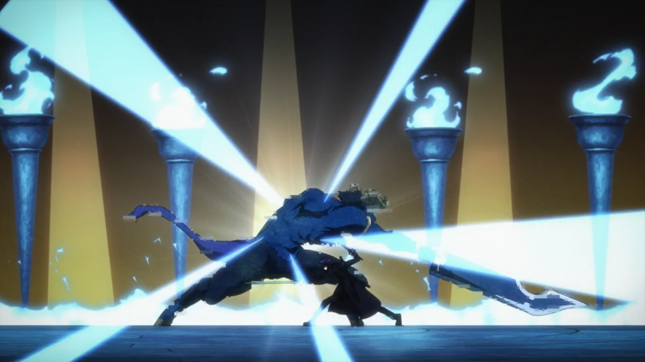 Au plus profond des étages intermédiaires d’Aincrad, le combat contre le boss présente des temps de recharge critiques, une coordination de groupe et des fenêtres d’explosion de dégâts. A-1 Pictures a mis en scène la rencontre avec une arène à plancher montant et des occlusions de piliers qui forcent le jeu de position. La scène démontre l’activation à double usage et le contrôle de l’aggro, codifiant des mécanismes récurrents dans les arcs ultérieurs. Les documents post-épisode et les liens avec le jeu faisaient référence aux modèles d’attaque du boss et aux seuils de HP comme points de données canoniques.