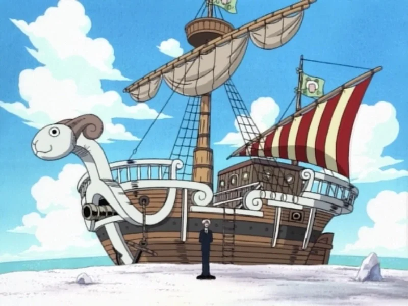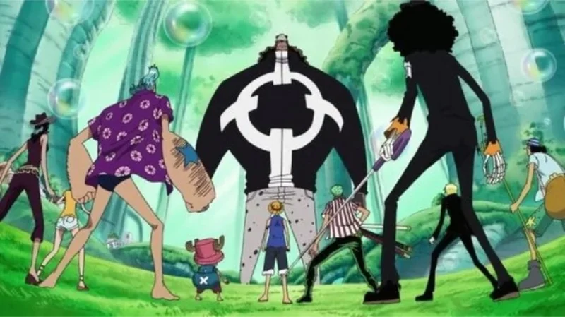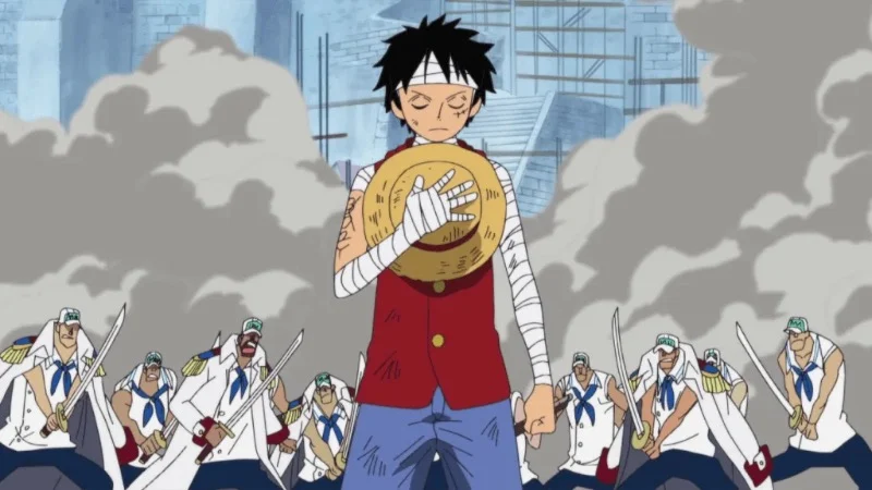 Dans l’arc d’Arlong Park, le point de rupture de Nami arrive au bord de la route où elle supplie finalement Luffy de l’aider. Il met son chapeau sur sa tête et se dirige vers les portes du parc avec Zoro, Sanji et Usopp, et la carte de titre tombe alors qu’ils marchent. La scène établit le prochain mouvement de l’équipage sans aucune ambiguïté. L’épisode suivant s’ouvre sur les Chapeaux de Paille démantelant les forces d’Arlong et déchirant l’enceinte.