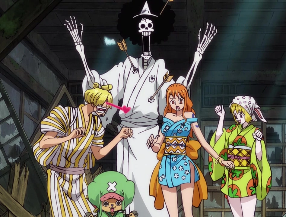 Sanji transporte ensuite Nami, Chopper, Brook et Carrot en lieu sûr, mais ils perdent Luffy en cours de route avec le Sunny. Le groupe cherche alors à retrouver Luffy, allant jusqu’à plonger au fond des eaux de Wano, mais ne trouve que sa Life Card. Cependant, ils retrouvent ensuite Kinemon, qui les conduit aux ruines du château de Kozuki Oden, où ils retrouvent finalement Luffy.