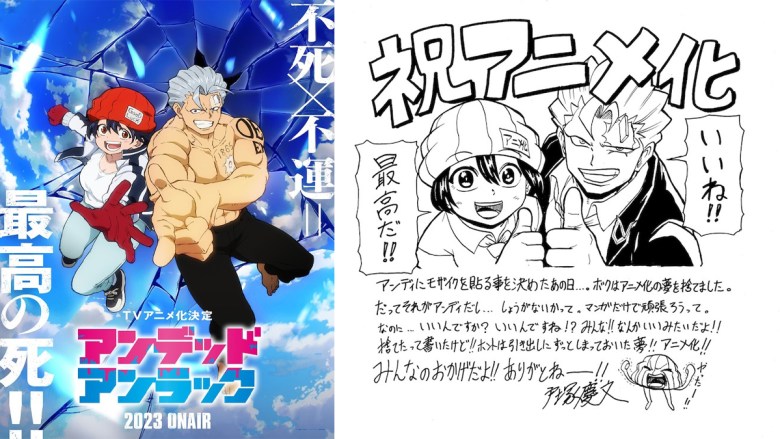 Illustration de célébration grandeur nature par Yoshifumi Tozuka en ce qui concerne son manga Undead Unluck obtenant un anime. Crédit photo : @natalie.mu