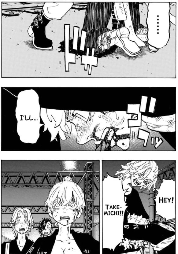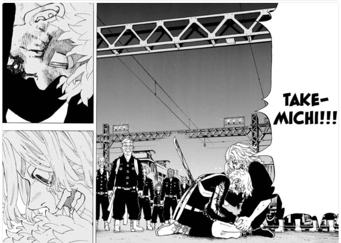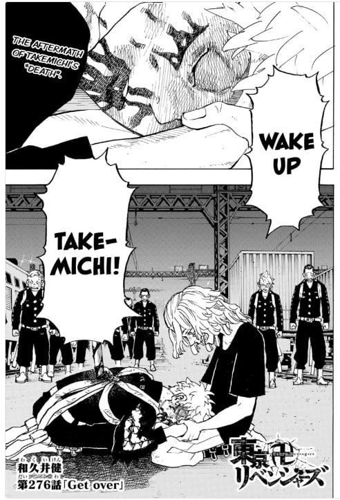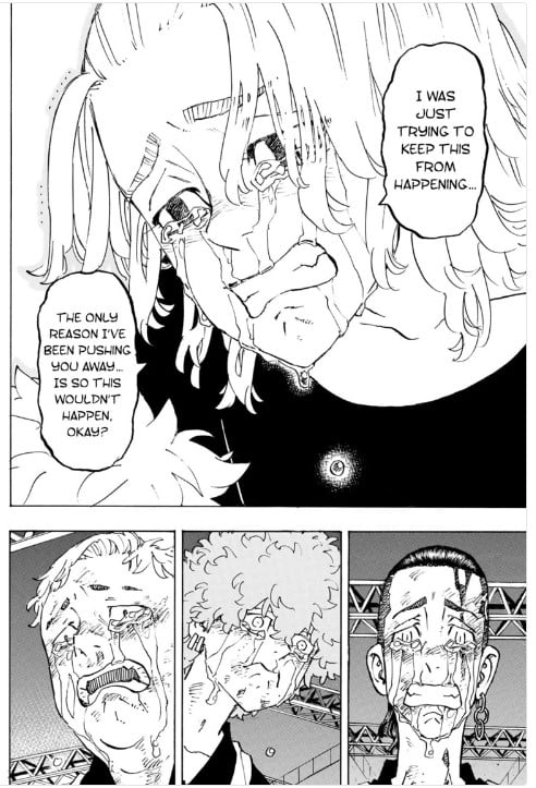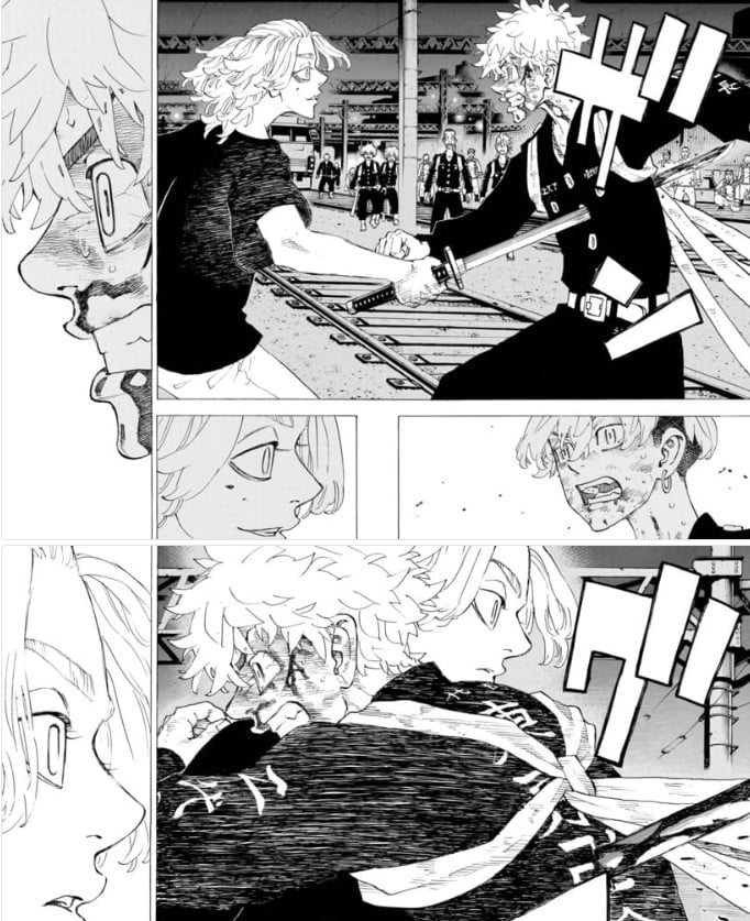 Mikey n’a pas la chance de vraiment traiter ce qu’il vient de faire, car tous les autres personnages réunis autour des deux amis commencent à pleurer et à pleurer la perte de Takemichi-s’attendant à ce que Takemichi soit mort ou sur le point de mourir. Takemichi tombe alors à genoux en saignant sur le sol, le katana dépassant toujours de son dos, suivi de Mikey tenant Takemichi en criant de désespoir.