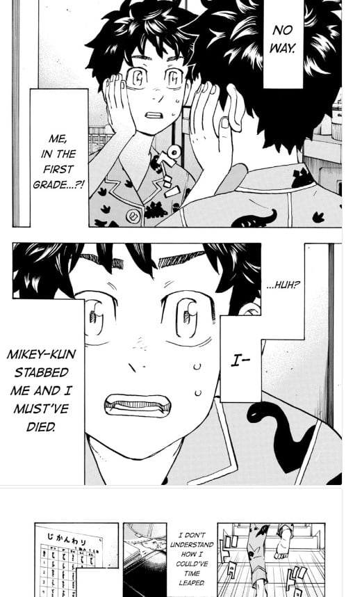 Cette expérience de mort imminente ne prend pas le dessus sur Takemichi, car il prend Mikey par la main alors qu’il commence à perdre son dernier l’énergie vitale et ses capacités de saut dans le temps commencent à s’activer. Cela aboutit finalement à ce que Takemichi saute une fois de plus dans le temps, après quoi il rencontre un jeune Mikey qui est apparemment au courant des événements qui se sont déroulés sur différentes chronologies.
