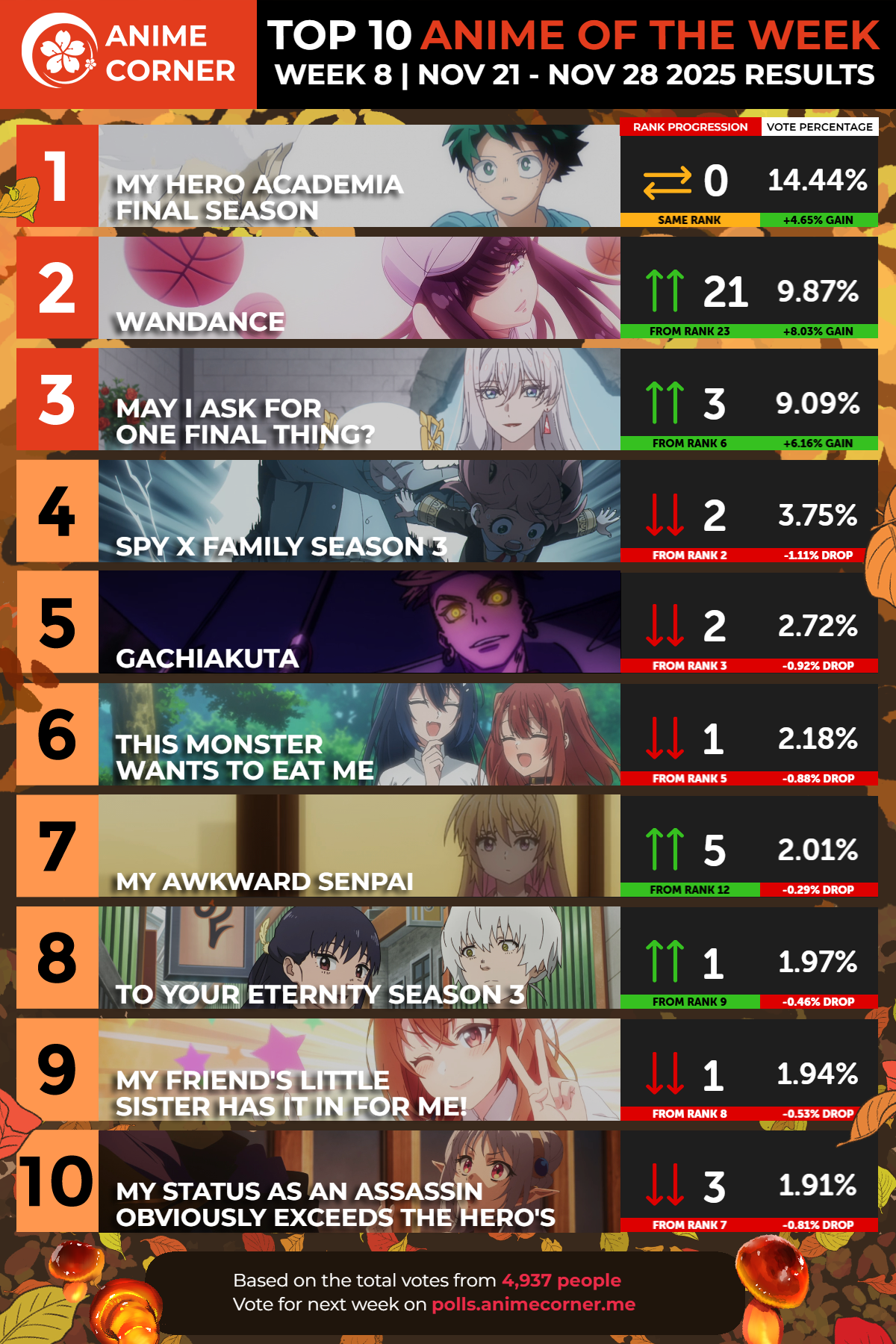 Jajak pendapat mingguan kedelapan untuk musim anime Musim Gugur 2025, yang diselenggarakan oleh Anime Corner, telah selesai. Dengan lebih dari 4.000 suara dari penggemar di seluruh dunia, hasilnya sudah masuk, mengungkapkan 10 episode anime paling disukai minggu ini. Pemeringkatan tersebut menampilkan perpaduan antara favorit yang konsisten dan entri baru yang menarik yang menonjol di musim ini.