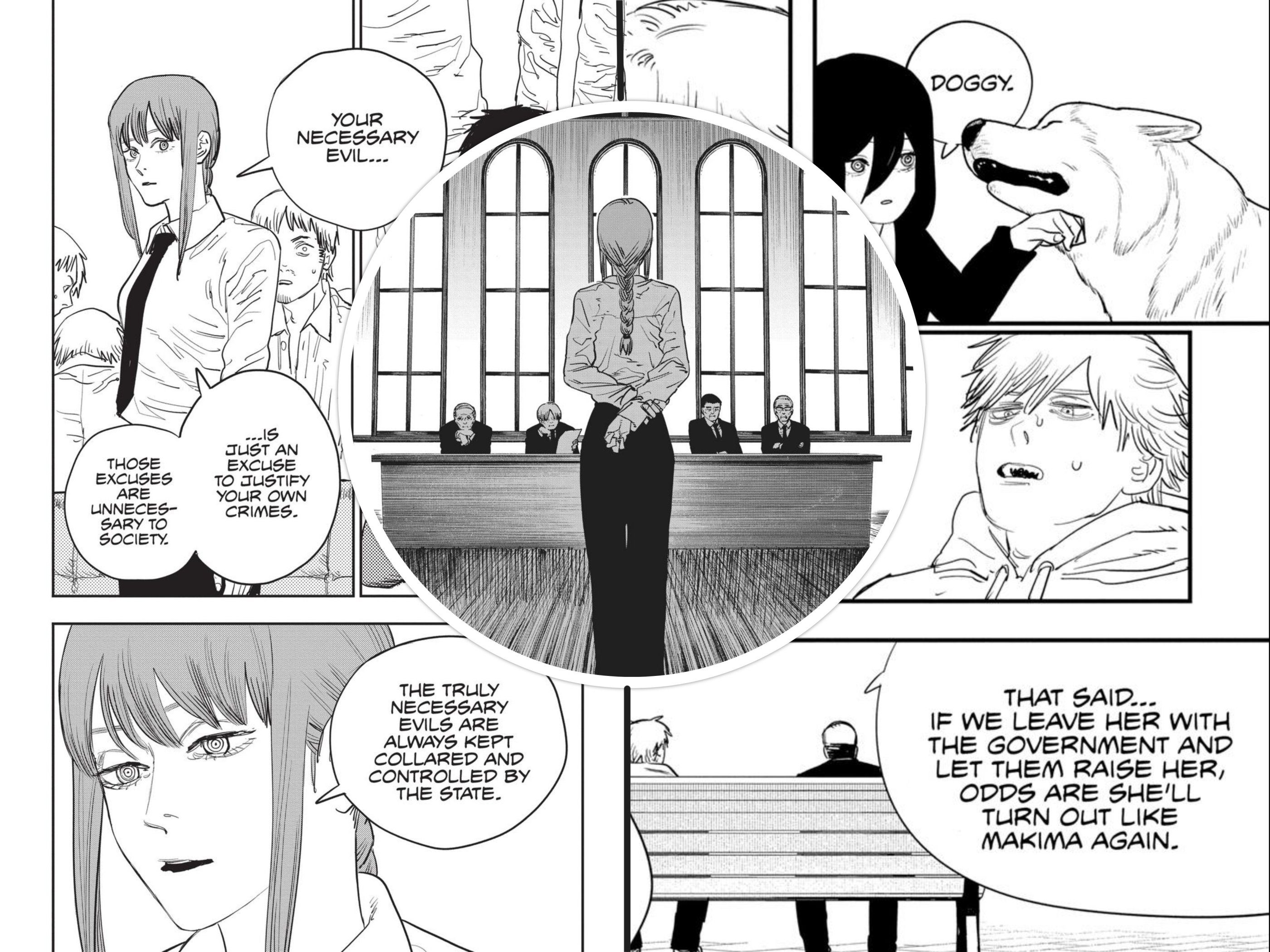 Fujimoto menyajikan gambaran suram Manusia Gergaji dari perspektif politik, karena negara-negara saling membenci dan pemerintah Jepang tidak akan ragu untuk menggunakan bermain curang untuk mengambil kendali negara lain. Bagaimana? Makima mengungkapkan bahwa operasi eliminasi Gun Devil adalah tipuan untuk memikat bagian-bagian Iblis yang dimiliki negara lain.