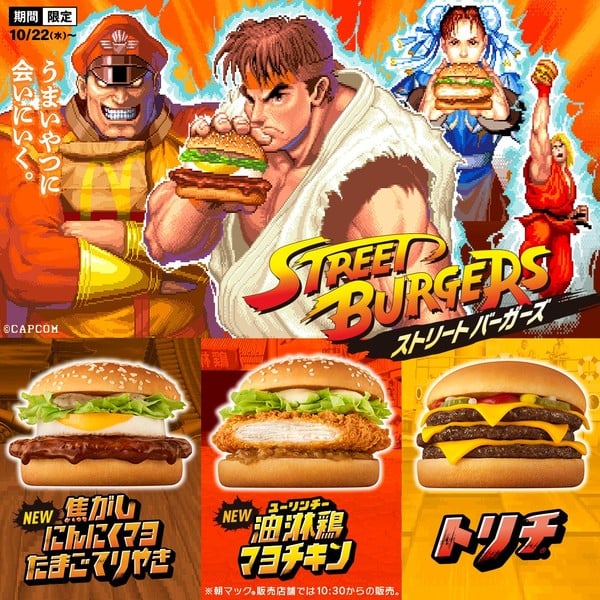 McDonald’s Japan e il franchise di Street Fighter hanno annunciato giovedì una collaborazione con un poster con i personaggi Ryu, Chun Li, Ken Masters e M. Bison. La collaborazione inizia il 22 ottobre con tre hamburger in collaborazione: il Kogashi Ninniku Mayo Tamago Teriyaki (uovo teriyaki con maionese all’aglio carbonizzato), Yóulínjī Mayo Chicken (pollo cinese fritto con maionese) e il TriChee (triplo cheeseburger).