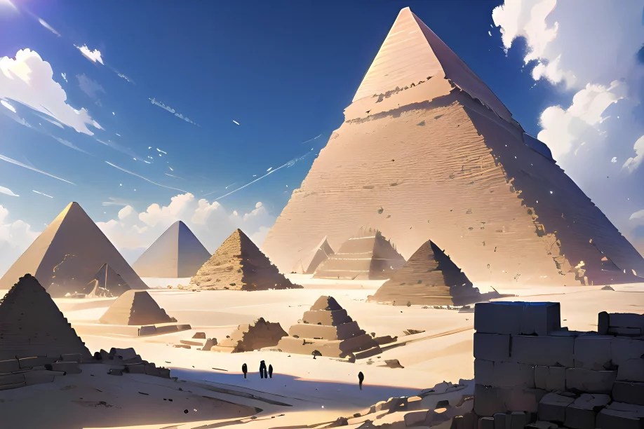 エジプト: アニメの世界では、ギザの大ピラミッドはさらに高くそびえ立ち、その磨かれた石灰岩の表面はきらめく夕日の光を反射しています。