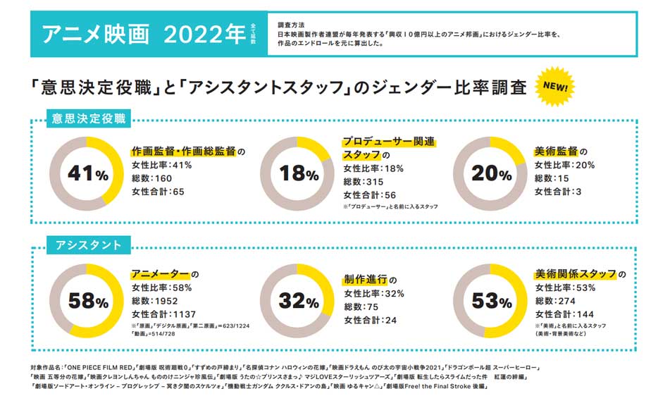 今回はに伴い、調査範囲はアニメ映画だけでなく劇場作品にも拡大された。それに加えて、新しい調査では、意思決定の立場だけに焦点を当てるのではなく、アニメ映画業界における「アシスタントの役割」の男女比も調査しました。