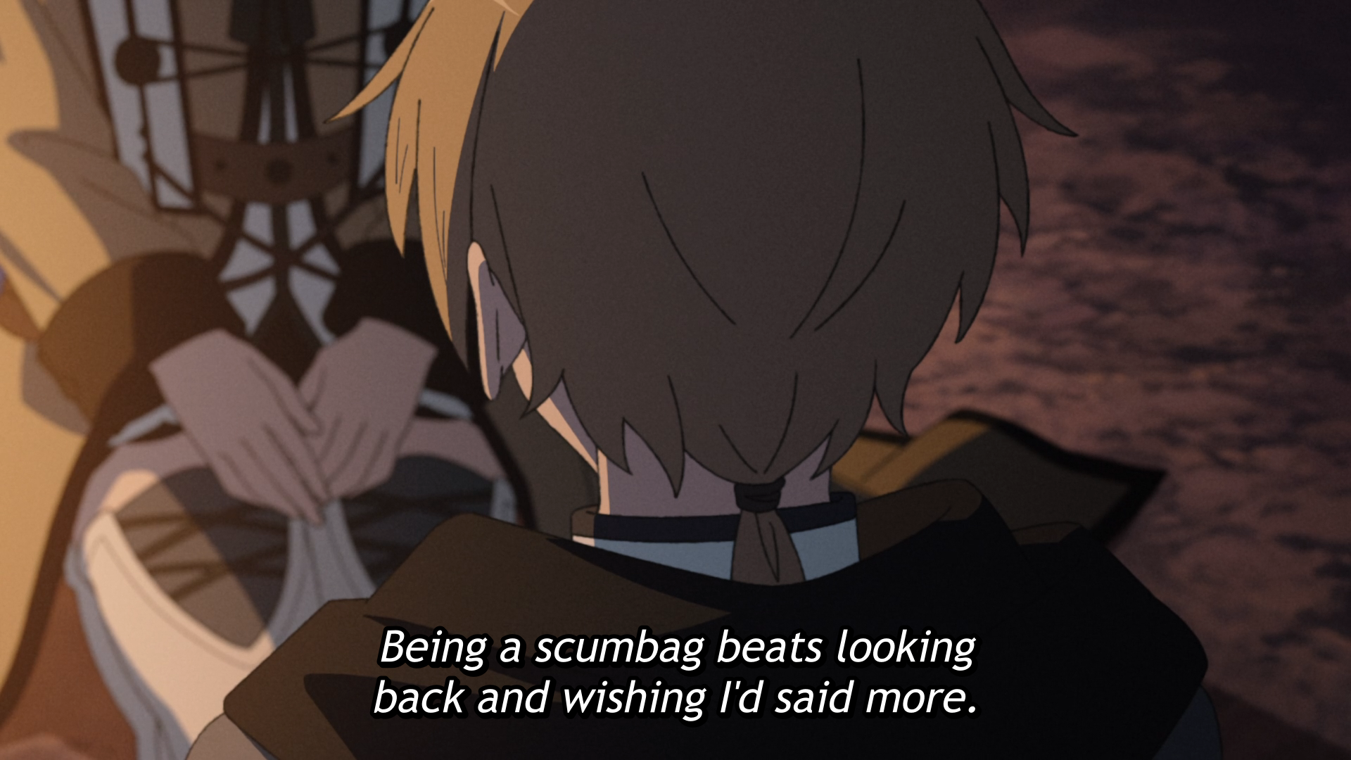 Rudy အမှားလုပ်ခဲ့သည်။ လွန်ခဲ့သည့်အပိုင်းအနည်းငယ်က သူမအပေါ်သစ္စာရှိမည်ဟုပြောပြီးနောက် Sylphie ကိုလှည့်စားခဲ့သည်။ ဒီအချက်နဲ့ ပတ်သက်ပြီး နည်းလမ်းမရှိသလို သူက ကောင်းမွန်တဲ့ ရွေးချယ်မှုတစ်ခုလို့ ပြောဖို့ မကြိုးစားပါဘူး။ သို့သော်၊ Rudeus ဇာတ်ကောင်အဖြစ် ကျွန်တော်နှစ်သက်သော အကြောင်းရင်းတစ်ခုမှာ ကလေး၏ စိတ်ပိုင်းဆိုင်ရာ ဉာဏ်ရည်ဉာဏ်သွေးကို တစ်ခါတစ်ရံ ပြသပေးစဉ်တွင် သူ၏အတိတ်ဘဝက အရွယ်ရောက်ပြီးသူ၏ တွေးခေါ်ပုံနည်းလမ်းကို ပေးဆောင်ခဲ့သည့်အချက်ဖြစ်သည်။ ပုံမှန်အတိုင်းပဲ၊ သူလုပ်ခဲ့တာတွေကို ချက်ချင်းသိပြီး Sylphie က သူအမှားလုပ်ခဲ့တာကို သိတယ်။ သို့တိုင်၊ ပေါလ်သေဆုံးပြီးနောက် သူ့ဘာသာသူ ပြန်လည်ကောင်းမွန်လာရန် အခွင့်အလမ်းမရှိတော့ဘဲ အရာအားလုံးကို နောက်တစ်ကြိမ် စွန့်လွှတ်လုနီးပါးဖြစ်ခဲ့သည်။