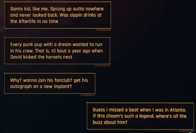 Бид дахиж даалгавраа сүйтгэхгүй, гэхдээ та Фалькотой харилцаж болно гэж хэлэх болно. Cyberpunk 2077-ийн үеэр амьд гэдгээ илчилсэн бөгөөд тэрээр Дэвид болон түүний түүхийн талаар илүү ихийг олж мэдэхэд тань туслах болно. Даалгаврын төгсгөлд өгөх шагнал нь бас сайхан бөгөөд хэрэв та шоуг үзсэнийхээ дараа DLC тогловол тэр мөч үнэхээр гайхалтай байх болно.