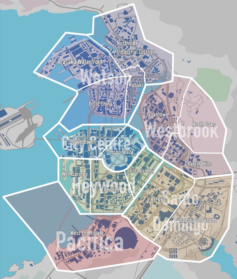 Арасака эдийн засгийн уналтыг ашиглан жижиг компаниудын ашиг хонжоо хайсан. зовлон зүдгүүрт өртөж, удалгүй Шинэ АНУ-ын хамгийн баян мегакорпуудын нэг болжээ. Шөнийн хот нь найман дүүрэгтэй бөгөөд тус бүр нь амьдралын тодорхой түвшинтэй байдаг. Жишээ нь, телевизийн шоутай холбоотой дүүргүүдийг харьцуулж үзье – Дэвидийн гэр нь хотын хамгийн эртний дүүрэг бөгөөд амьдрахад хамгийн ядуу газруудын нэг болох Санто Доминго байсан.