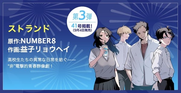 Шогакуканы долоо хоног тутмын Shonen Sunday сэтгүүлийн энэ оны 37, 38 дахь дугаарыг 8-р сарын 7-ны өдөр нийтэлснээр зохиолч №8, зураач Рёүхэй Масуко нар Странд нэртэй шинэ мангагаа 9-р сарын 4-нд сэтгүүлийн 41 дэх дугаарт гаргахаар болжээ.