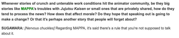 लुकास, म तपाईंसँगै छु। तर अगाडि बढ्नु अघि MAPPA को प्रतिभाको बारेमा तपाइँको बिन्दुलाई पछ्याउनुहोस्, हामी फेरि अर्को स्थितिमा छौं जहाँ समस्याहरू माथिबाट तल आउँदैछन्। हालैको Crunchyroll subs अवस्थाको बारेमा हाम्रो बकबकबाट यो धेरै टाढा छैन, वास्तवमा।