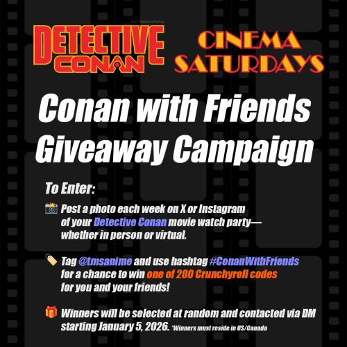 În plus, TMS Entertainment va lansa și campania cadou „Conan with Friends” pentru a comemora ultima etapă a Cinema Saturdays și cu 10 săptămâni înainte de aniversarea a 30 de ani a seriei anime Detective Conan. Începând cu 1 noiembrie 2025, fanii sunt invitați la petrecerea de vizionare „Detective Conan Cinema Saturdays” și partajează o fotografie – în persoană sau virtuală – pe Twitter/X sau Instagram cu eticheta @tmsanime și hashtag-ul #ConanWithFriends. Petrecerea de vizionare începe în fiecare sâmbătă la 19:00 PST/22:00 EST pe Anime! pe canalul YouTube oficial TMS.