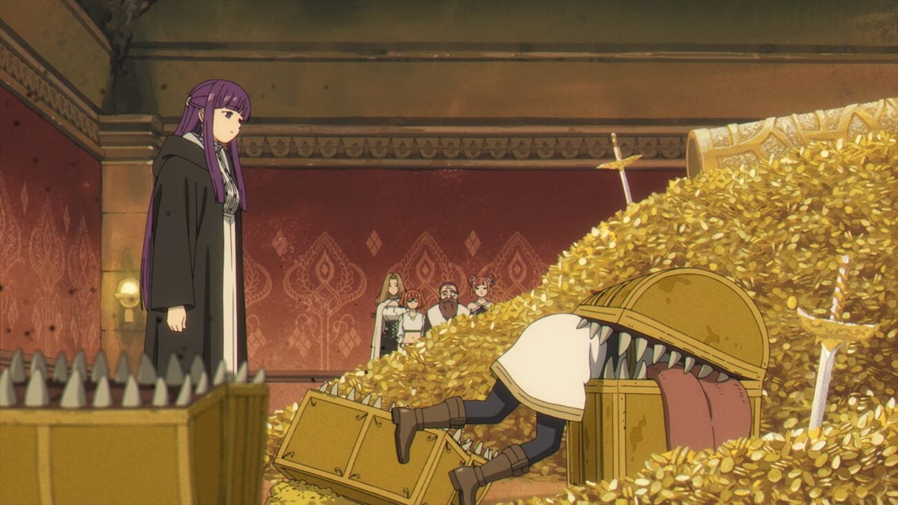 Așa cum puteți vedea în serie, cantitatea de comori, care a aparținut probabil primului rege și posibil chiar conducătorilor de mai târziu ai Dinastia Unificată, care a adus mai multe comori acolo, a fost enormă. Erau monede, bijuterii și obiecte de valoare, precum și câteva cufere mari, care conțineau probabil și mai multe obiecte de valoare. Bineînțeles, au existat și niște Mimics acolo, care ne-au oferit încă o dată câteva râsete, deoarece Frieren – firesc – a ajuns să se îndrăgostească din nou de unul.