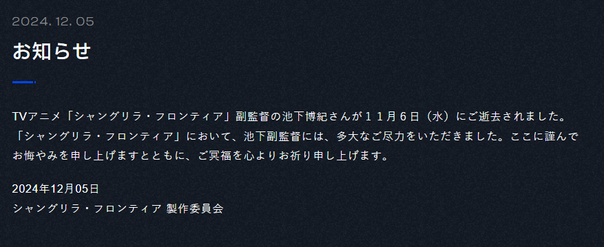 Chúng tôi vô cùng đau buồn thông báo rằng ông Hiroki Ikeshita, trợ lý đạo diễn của bộ phim hoạt hình truyền hình Shangri-La Frontier, đã qua đời vào thứ Tư, ngày 6 tháng 11.