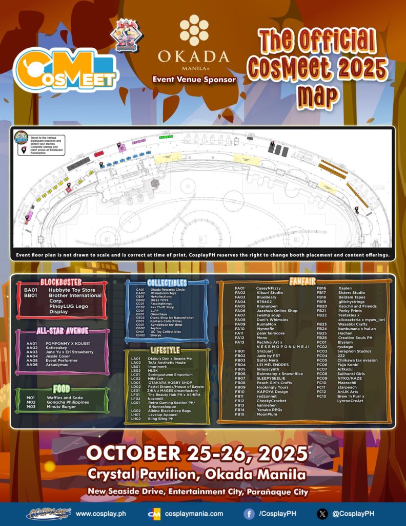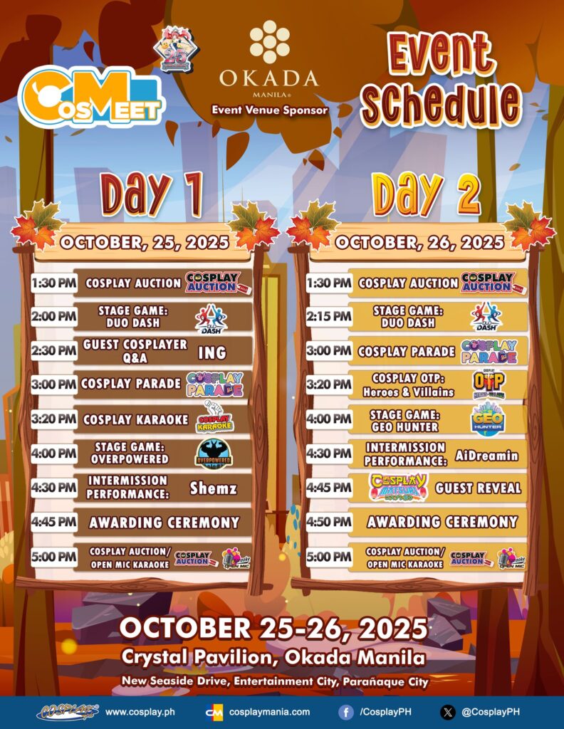 CosMeet 2025 dự kiến sẽ diễn ra vào ngày 25-26 tháng 10 tại khách sạn 5 sao Okada Manila danh giá ở New Seaside Drive, Entertainment City, Parañaque City. Sự kiện mùa thu anime và cosplay kéo dài hai ngày sẽ miễn phí cho tất cả mọi người và sẽ có các trò chơi và cuộc thi thú vị, một cuộc diễu hành cosplay hoành tráng, biểu diễn trên sân khấu và hơn 100 gian hàng. Người dẫn đầu Lễ hội Mùa thu năm nay là cosplayer Coser Ing đến từ Hàn Quốc.