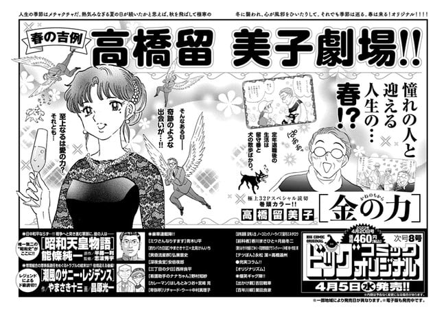 Tạp chí Big Comic Original của Shogakukan số thứ bảy năm nay đã thông báo vào thứ Hai rằng Rumiko Takahashi (Inuyasha, Ranma 1/2, Urusei Yatsura) sẽ vẽ một manga one-shot mới có tựa đề”Kane no Chikara”(The Power of Money) như một phần của sê-ri Rumic Theater (Takahashi Rumiko Gekijō) của cô trong số tiếp theo của tạp chí vào ngày 5 tháng 4. Manga sẽ có 32 trang và sẽ có trang mở đầu màu.